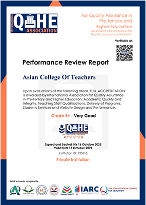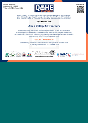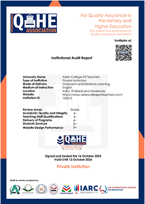 With an accreditation from an internationally acclaimed accreditation organization like QAHE, Asian College of Teachers promises to ensure continuous enrichment of course delivery, teaching quality and research tasks to achieve and maintain its international standard in every aspect of providing training services to its students from across the globe.