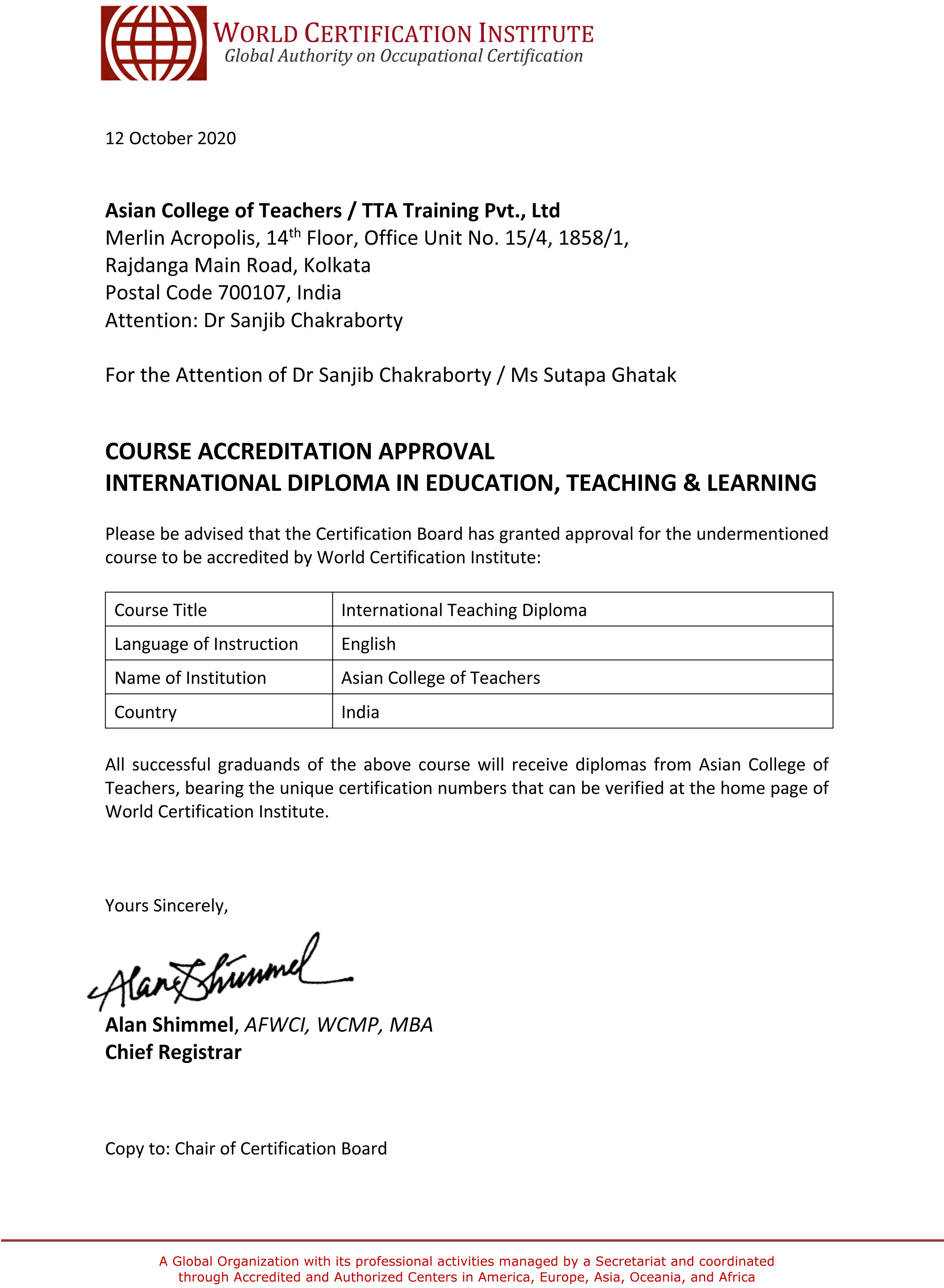 WCI has accredited ACT’s International Teaching Diploma Course after carefully examining, validating and authenticating the program. The parameters included course content & duration; qualifications & competence of trainers; financial strength & integrity of course providers; available facilities & resources; method of delivery & assessment; and most importantly, their relevance to occupational & career development, the Council at the WCI has recognized our ITD course as being at par with global educational standard and bestowed the coveted accreditation on the course.