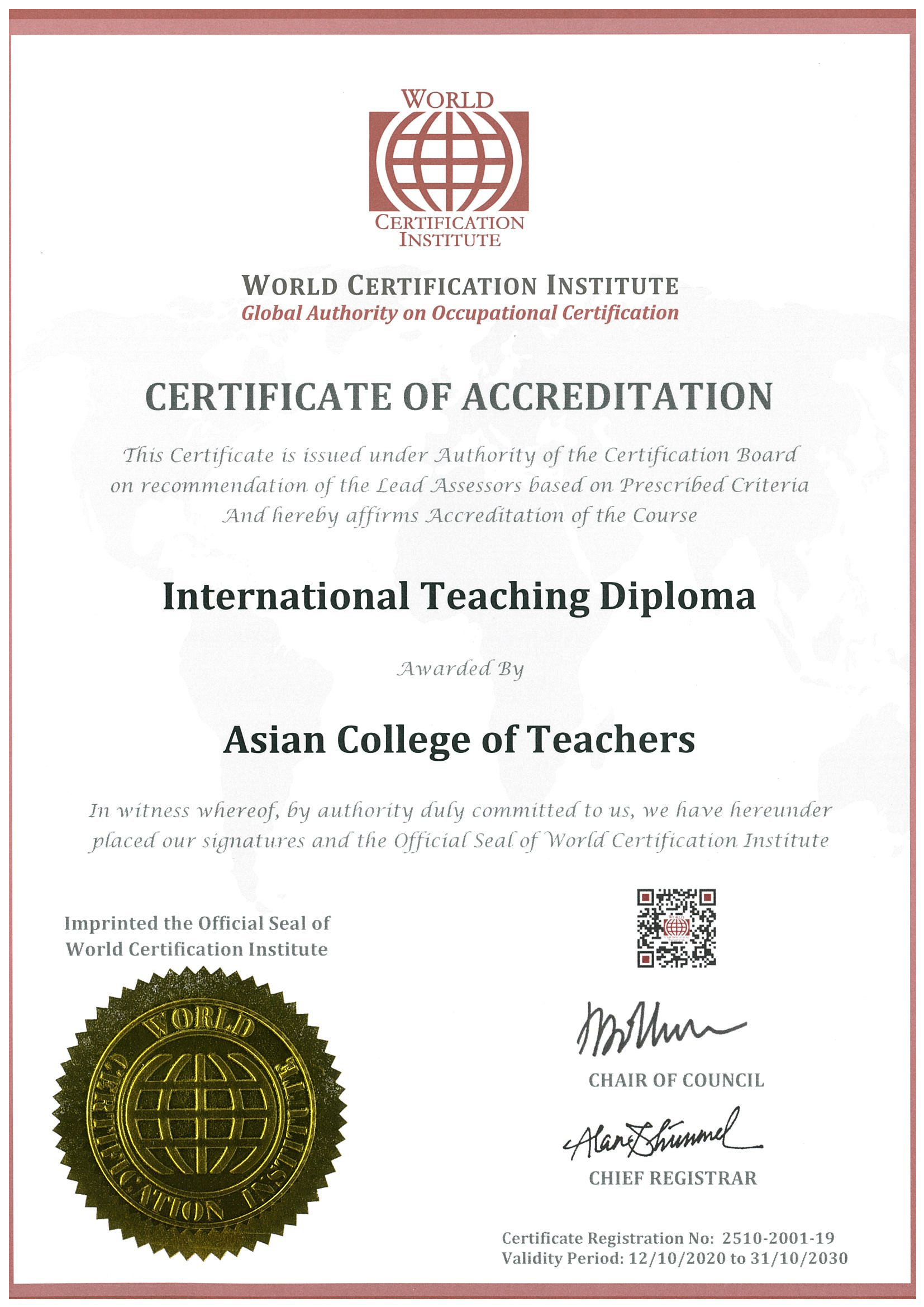 We at Asian College of Teachers (ACT) aspire to advance teaching and learning with a core purpose to make teacher education accessible to every corner of the globe. We strive to provide new knowledge and academic solutions to make a positive impact on teacher education and beyond. In a bid to impart quality training and build academic excellence, ACT collaborates with global accrediting bodies to meet the growing expectations of the students we educate. We are proud to share that World Certification Institute (WCI) has given accreditation to our International Teaching Diploma (ITD) course to provide the best in pre-primary training.